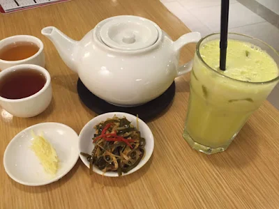 This is apple juice for about RM 10 and Pu-Er tea for RM 16 per pot! There were many pu-er tea leaves inside which makes the tea concentrated and you have ask for free hot water to replenish the teapot. There's also appetiser in black strips of vegetables with glass noodles in the center.